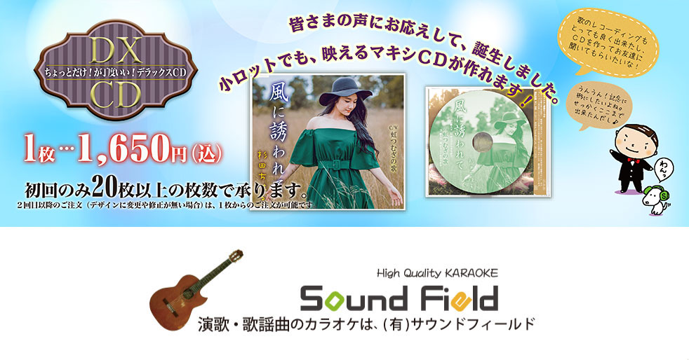 弊社では、歌の吹き込みが出来るスタジオを完備しております。歌も良い音で レコーディングすると、出来栄えが断然変わってきます。ご自身が納得いくまで、 何度でもワンフレーズごとに歌い直すことが出来ますのでご安心下さい。録音中はエンジニアが付き、録音後に音の微調整(トラックダウン)をして、より良いバランスで仕上げ致します。その日のうちに録音した音をお持ち帰りいただけます。