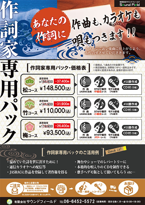 2コーラス編集やキーチェンジ編集は、歌手活動を続ける上で必要不可欠です。 弊社で制作されたカラオケはもちろん、他社で制作されたカラオケの編集もお気軽にお申し付け下さい。歌詞カードの作成、フルバンドアレンジの制作等も承っております。